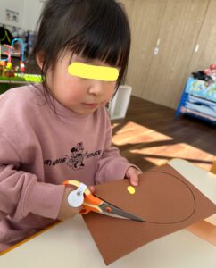 製作では、はさみで曲線切りに挑戦しました。広げるとハートやくまの形になり、