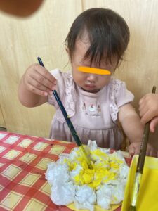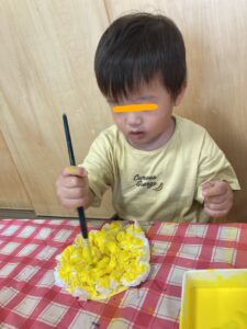 黄色い絵の具を白いお花紙の上から塗りました🌕