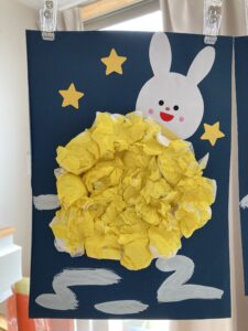 お月様の中には動物のシルエットを描いて、うさぎの折り紙にお顔も描いてもらいましたよ😊