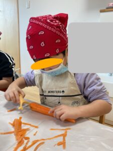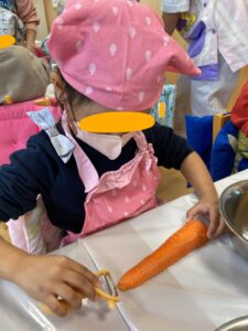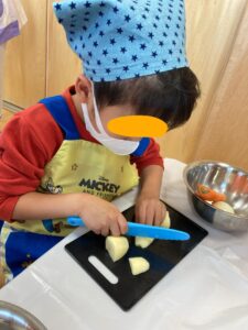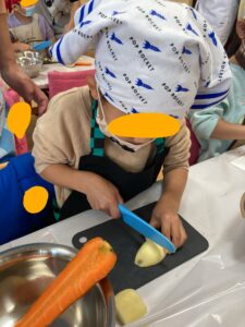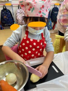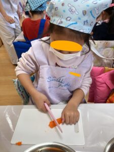 野菜をまな板の上に乗せること、手を切らないように野菜の上の方をおさえることを教えてもらいました!