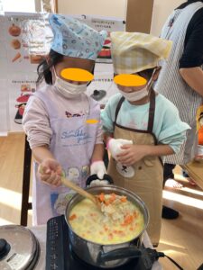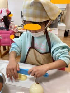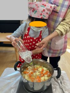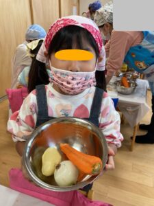 じゃがいもがコロコロ転がってしまって切りにくかったり、玉ねぎが目にしみたりと大変なところもありましたが、最後までよく頑張ってくれました!