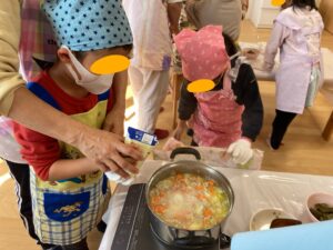 鍋をおさえる人、混ぜる人、ハサミで切る人、役割分担をして共同作業です!