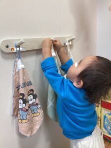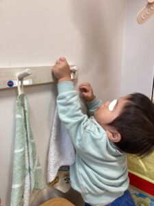 一生懸命タオル掛けにかけようと頑張ってくれています☺️