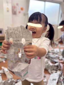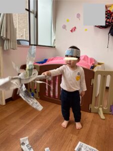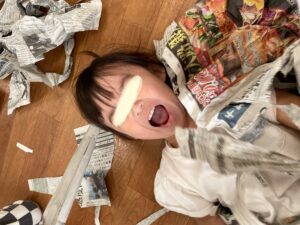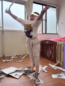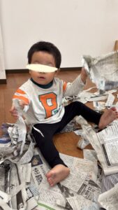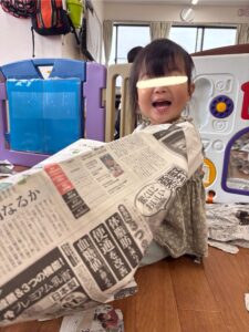 雪のようにひらひら降ってくる新聞紙に「わぁすごーい😊」と満面の笑みでしたよ。