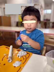 粘土遊びが始まると「お団子とハムとご飯を作ろっと😊」と、作りたい物のお話で盛り上がっていましたよ❣️