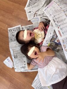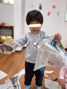 新聞紙遊びでは、指先を使ってビリビリ〜‼︎