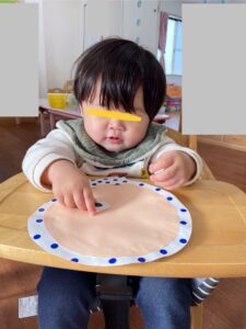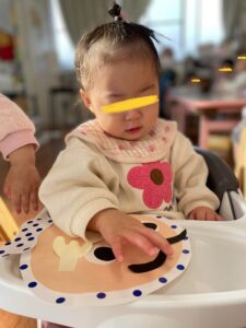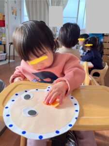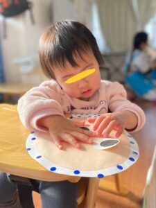 顔のパーツを一つずつ保育者から受け取ると、指にくっつきながらも自分でペタン!