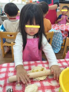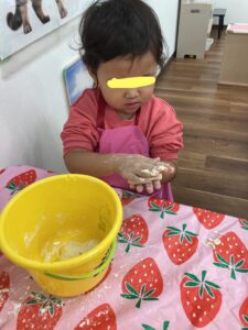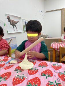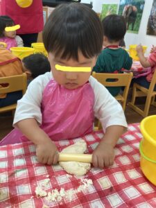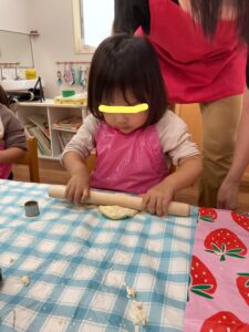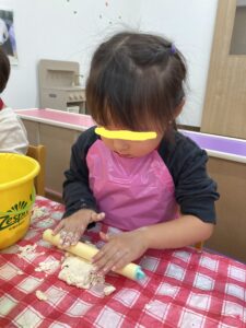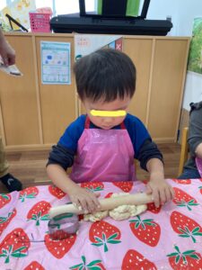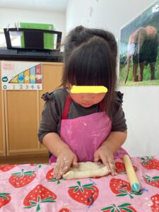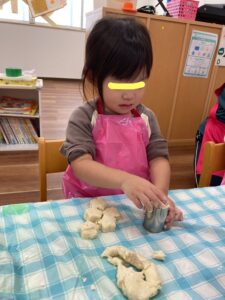 お部屋では小麦粉粘土でパン屋さんごっこを楽しみました🍞こねて、伸ばして型抜きしておいしいパンになぁれ!