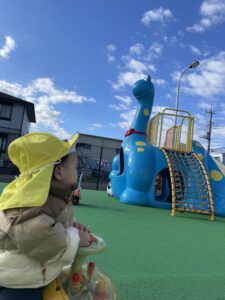 もう少ししたら、恐竜のすべり台でも遊べるようになるね😊