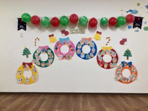 次は子どもたちが塗り絵をしたりシールを貼った飾りをリースに飾り付けます♪
