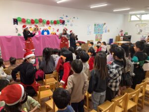 お部屋に集まり、まずは「クリスマスの鐘が」と「あわてんぼうのサンタクロース」の歌をうたいました。とっても元気よく歌って、サンタさんに届くといいな♪
