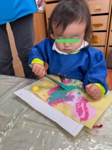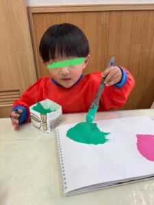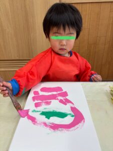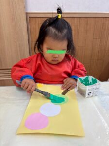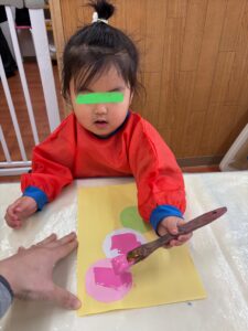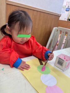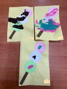 お団子製作(2026年2月17日) 今日は、ひな祭りにちなんで 三色団子に好きな味をトッピング あんこ、さくら、まっちゃ さぁ、どれにしようかなぁ😊 さくら色を選んで 上手に刷毛を持って塗り塗り まっちゃにするー! ひとつひとつ 丁寧にトッピング✨ もっと絵の具で塗りたーい!と 画伯登場! 刷毛を使って絵の具遊び 楽しいよね😊 りす組も刷毛を使いたいと挑戦! 出来上がりー🍡 美味しそうなお団子ができました 3月3日はひな祭り お雛様製作もお楽しみに🎎