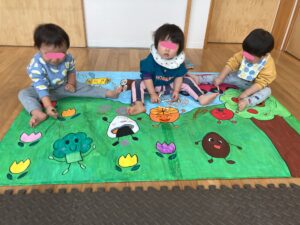 お部屋に戻り乳児さんはボールの豆で、幼児組さんは新聞で作った豆で…