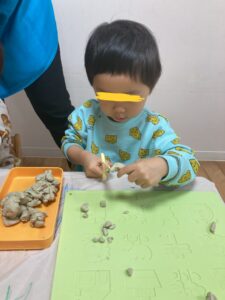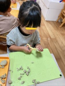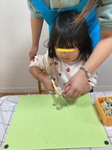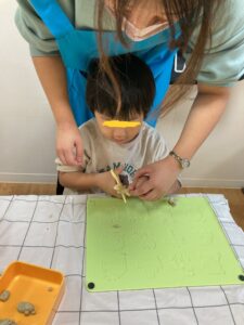 まずは、粘土のハサミを使って練習しています!