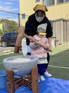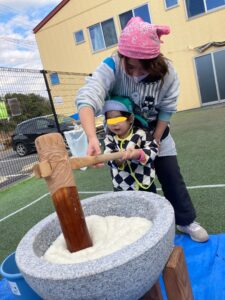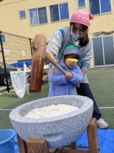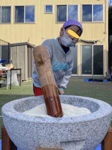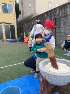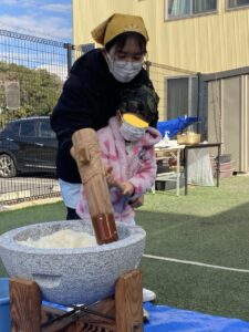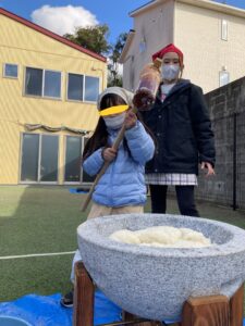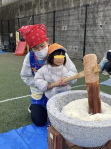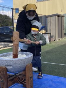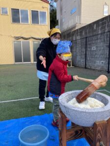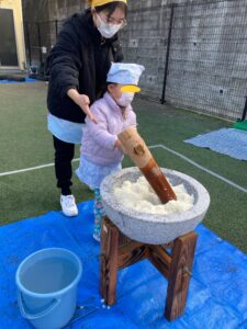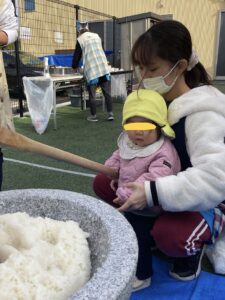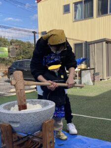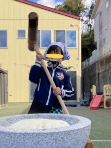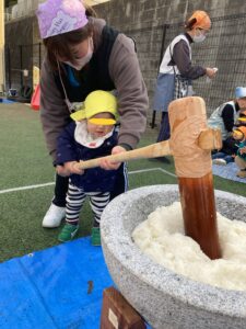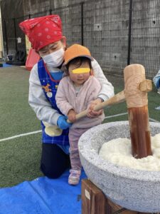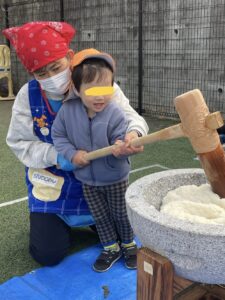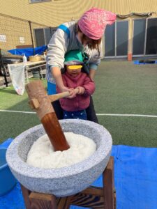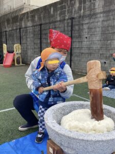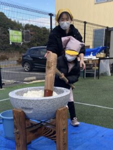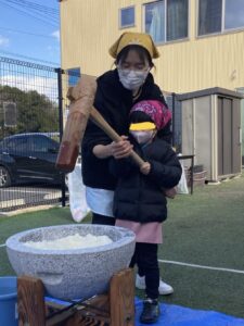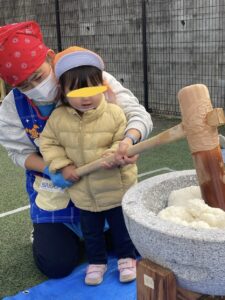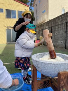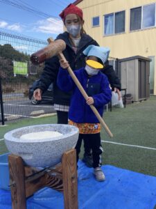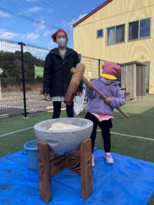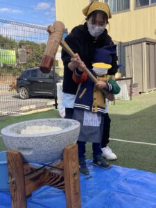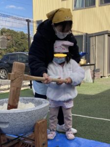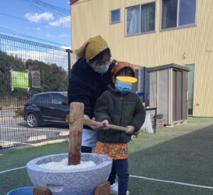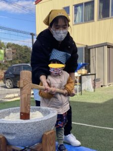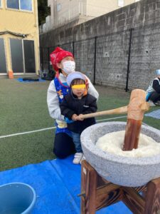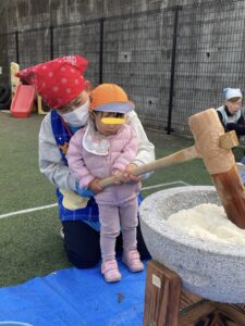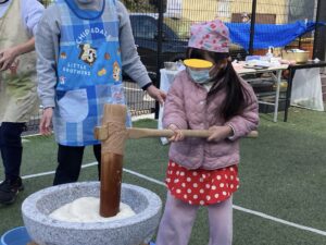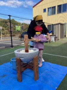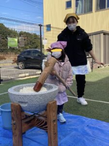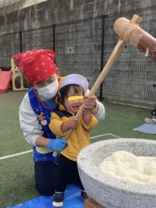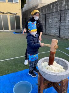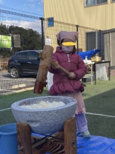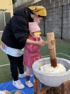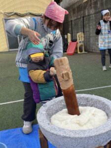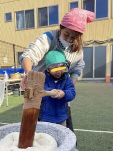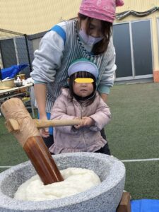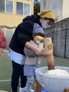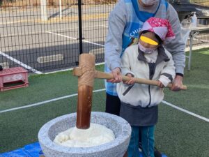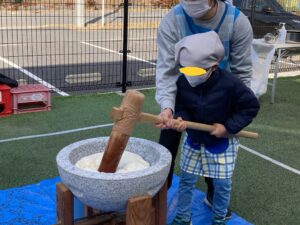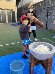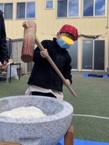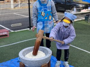 みんなで力を合わせてついたおもちは、幼児組さんは給食でいただきました。