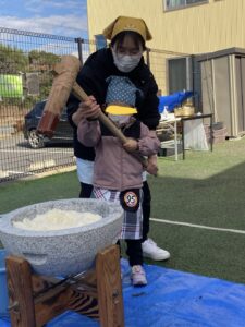 「みんなでよいしょ!とおいしいおもちをつこうー💪」と