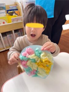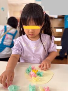 気球の模様は好きな色の花紙を選んで丸めます‼️