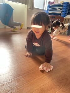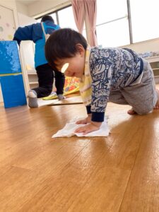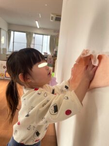 お部屋の床や壁、いつも使っている玩具などを保育者と一緒にきれいにしましたよ。