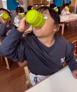 朝の会ではコップで水分補給。